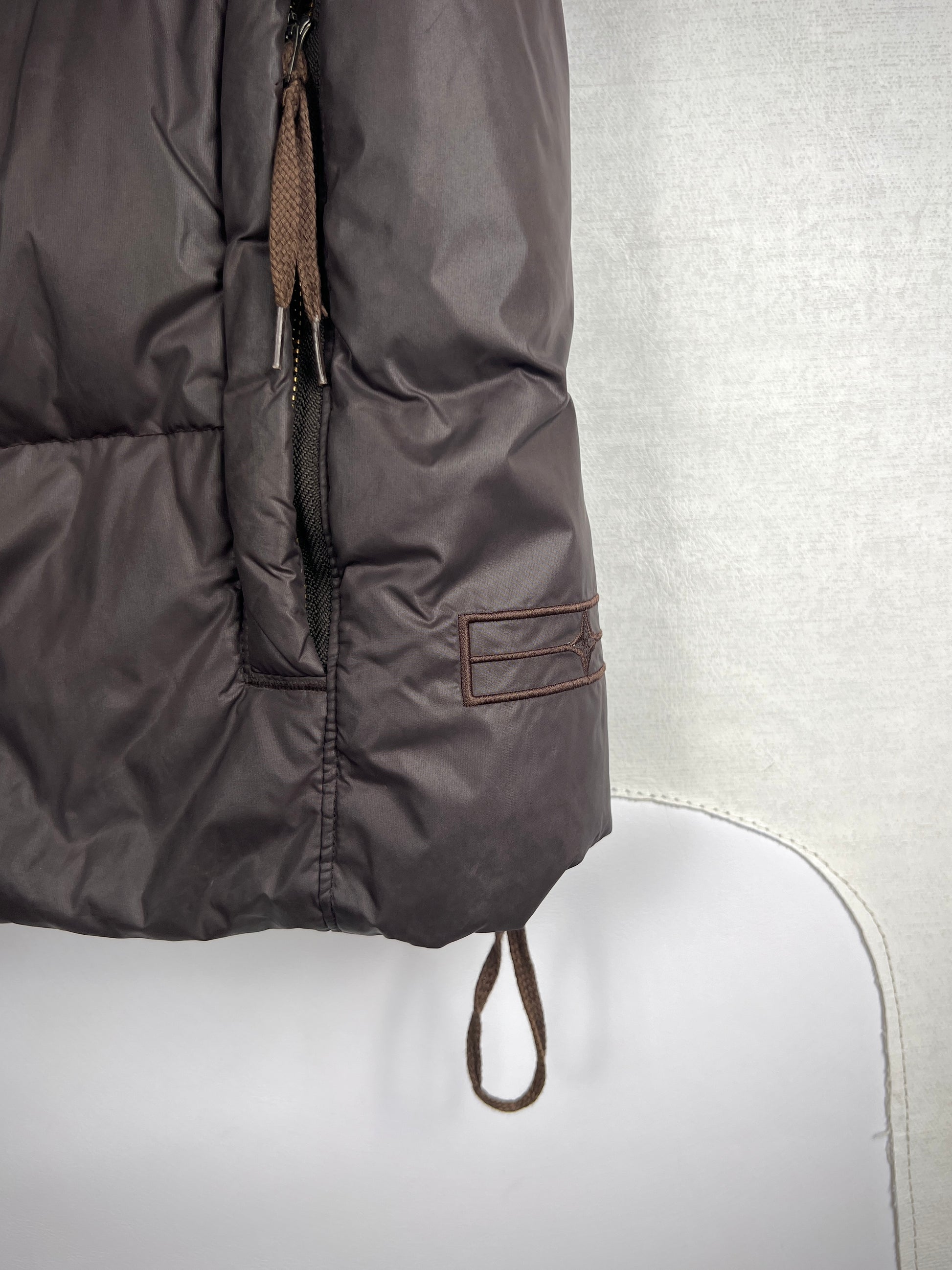 Nylon puffer gilet with adjustable straps and Stormhood, Brown color